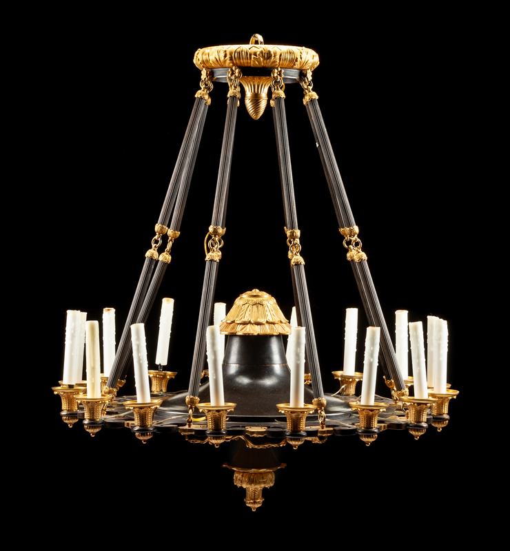 An Empire Gilt and Patinated Bronze Eighteen-Light Chandelier Height 40 x diameter 34 inches.