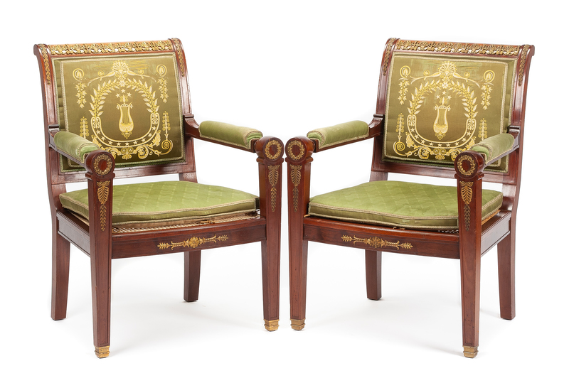 A Pair of Empire Style Gilt Bronze Mounted Mahogany Armchairs Height 37 inches.