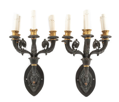 A Pair of Empire Style Gilt and Patinated Bronze Six-Light Sconces Height 21 inches.