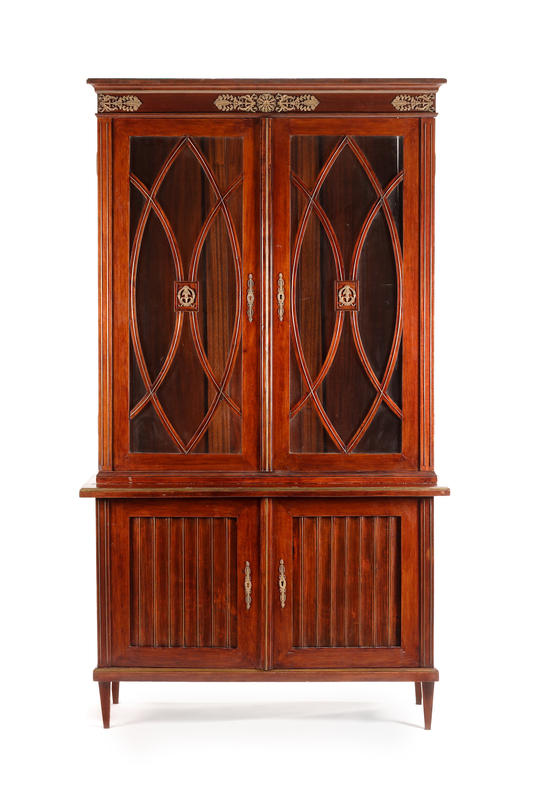 An Empire Style Gilt Bronze Mounted Mahogany Cabinet Height 86 1/4 x width 48 1/2 x depth 20 inches.