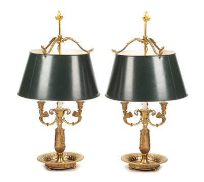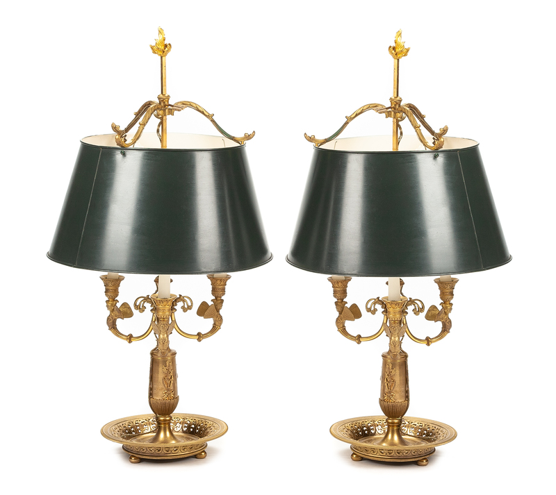 A Pair of Empire Style Gilt Bronze Four-Light Bouillotte Lamps Height overall 29 inches.