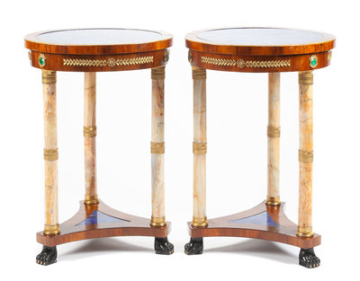 A Pair of Empire Style Gilt Bronze, Onyx and Lapis Lazuli Mounted Mahogany Gueridons Height 29 1/2 x diameter of top 20 1/2 inches.