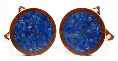 each having a circular lapis lazuli inset top set on three columnar supports ending in ebonized paw feet and joined by a tripartite medial shelf.