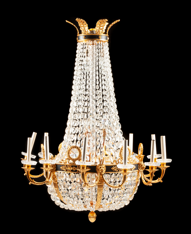An Empire Style Gilt and Patinated Bronze Twelve-Light Chandelier Height 46 x diameter 35 inches.