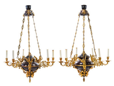 A Pair of Empire Style Gilt and Patinated Bronze Six-Light Chandeliers Height 40 x diameter 25 inches.