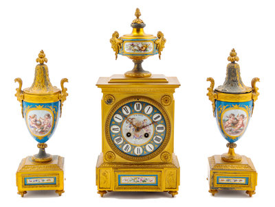 A Sevres Style Porcelain and Gilt Bronze Clock Garniture Height of mantel clock 18 inches.