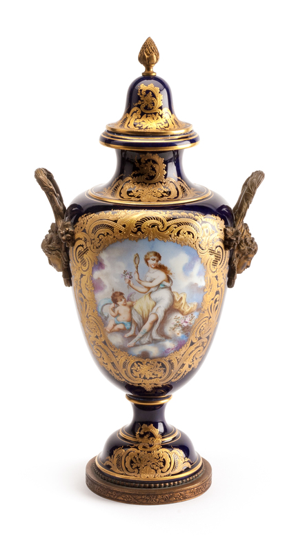 the domed cover having a pinecone finial, the baluster form body with loop handles terminating in female masks and an oval cartouche painted to depict a draped maiden and Cupid against a cobalt ground with gilt highlights, signed L. Bertren.