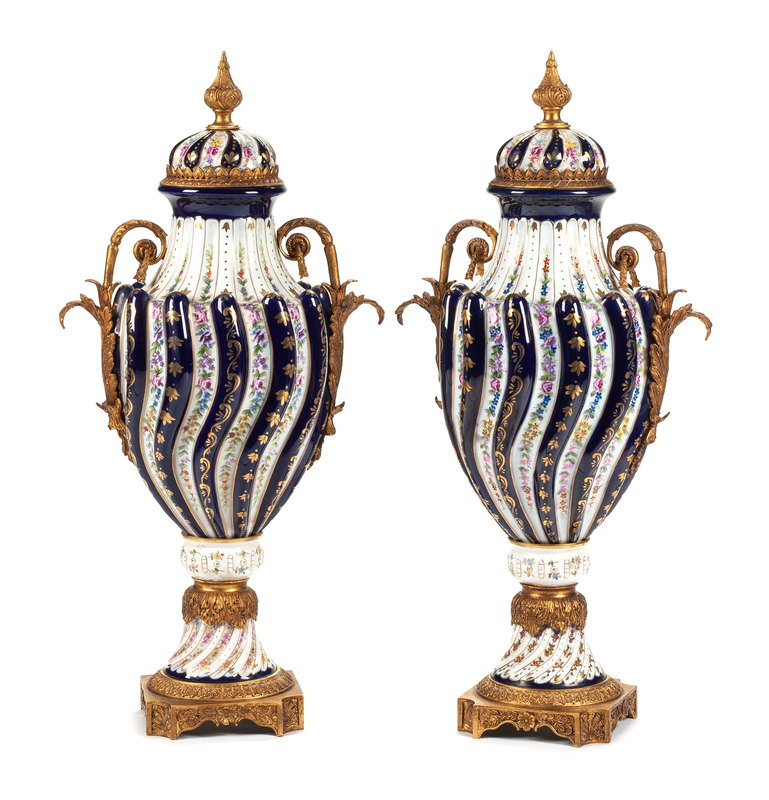 A Pair of Sevres Style Bronze Mounted Porcelain Urns Height 29 inches.