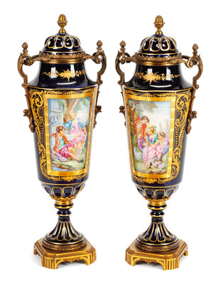 A Pair of Sevres Style Porcelain Covered Vases Height 21 1/2 inches.