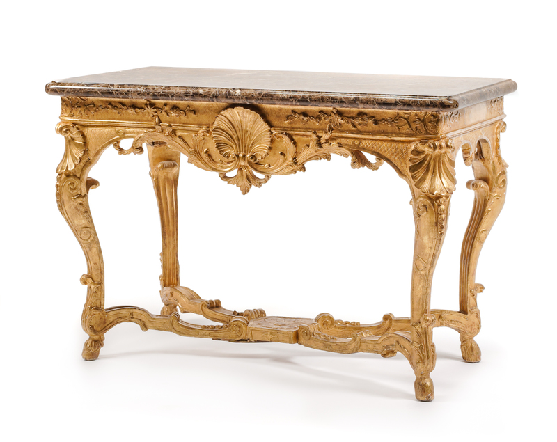 A Regence Carved Giltwood Console Table Height 31 1/2 x width 46 x depth 25 1/2 inches.