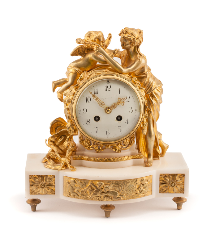 A French Gilt Bronze Mounted Marble Figural Mantel Clock Height 12 x width 11 x depth 5 1/2 inches.