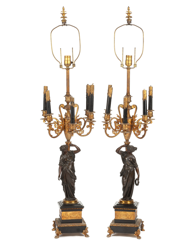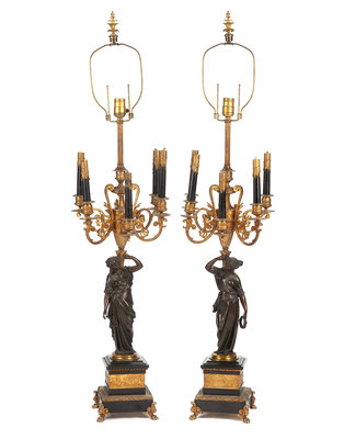 A Pair of French Gilt and Patinated Bronze Candelabra Mounted as Lamps Height of lamp fittings overall 42 inches; height of bronze 28 1
