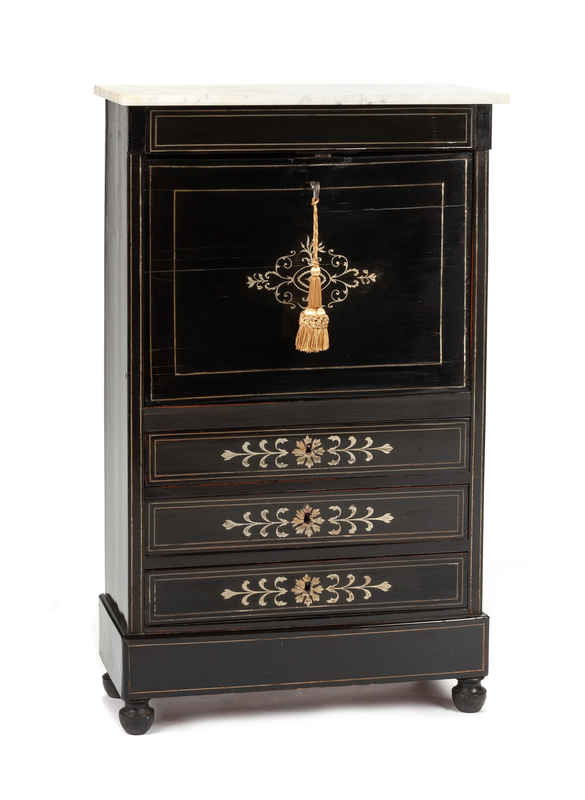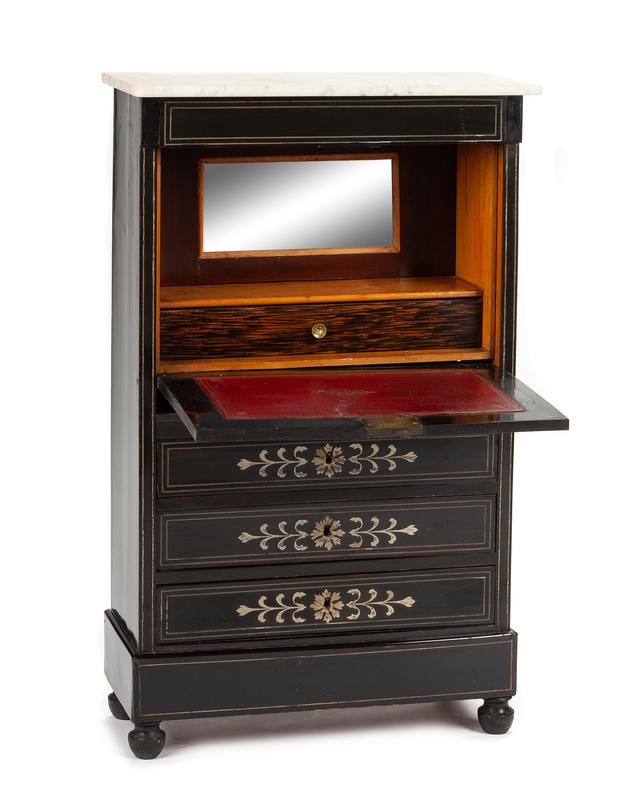 A Louis Philippe Style Diminutive Pewter Inlaid Ebonized Secretaire a Abattant Height 27 1/2 x width 17 x depth 7 3/4 inches.