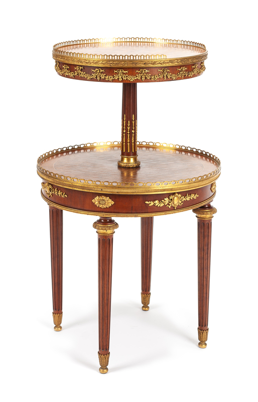 having two galleried circular tiers, raised on cylindrical fluted tapering legs.