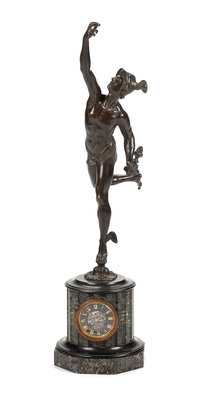 surmounted by a figure of Mercury after Giambologna, the dial with Roman numeral hours set within the fluted columnar marble base, raised on an octagonal plinth.