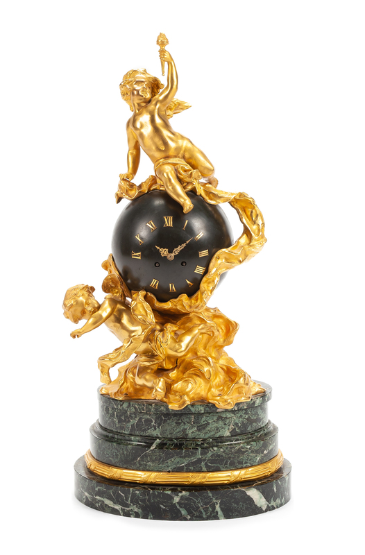 A Napoleon III Gilt and Patinated Bronze Mantel Clock Height 30 1/2 inches.