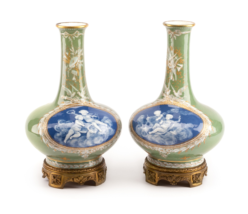 A Pair of French Gilt Bronze Mounted Pate-Sur-Pate Porcelain Vases Height overall 13 1/2 inches.