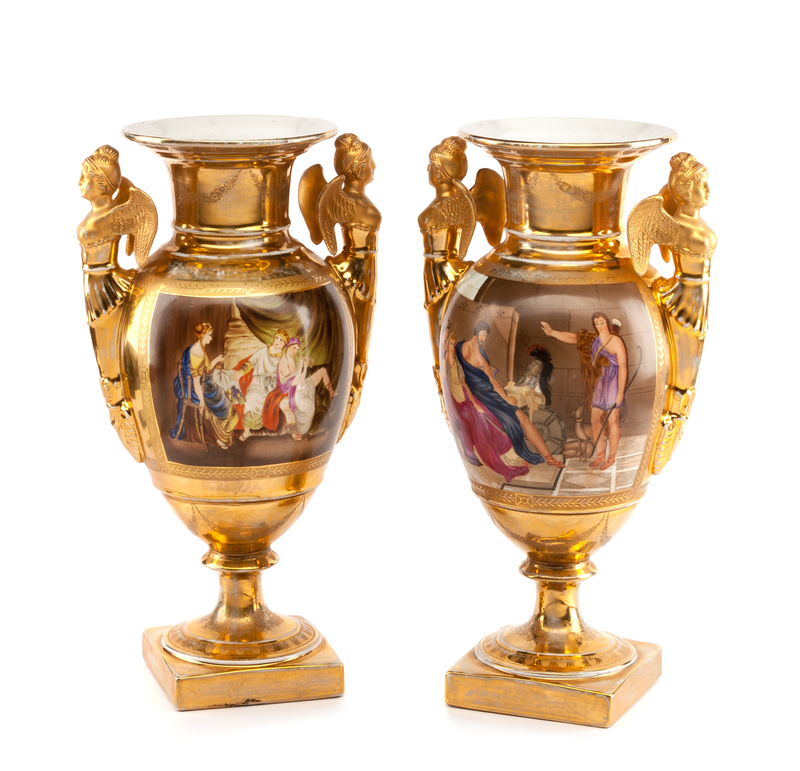 each of baluster form with winged figural handles, decorated with classical scenes, with spurious KPM marks to the underside.