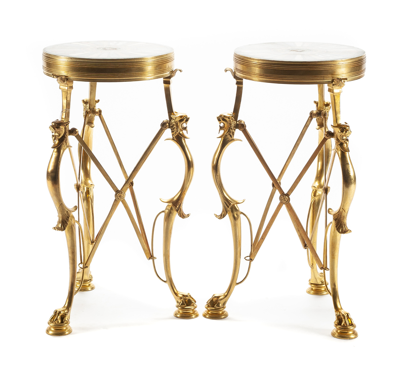 A Pair of French Neoclassical Style Gilt Bronze and Specimen Marble Gueridons Height 27 x diameter of top 15 inches.