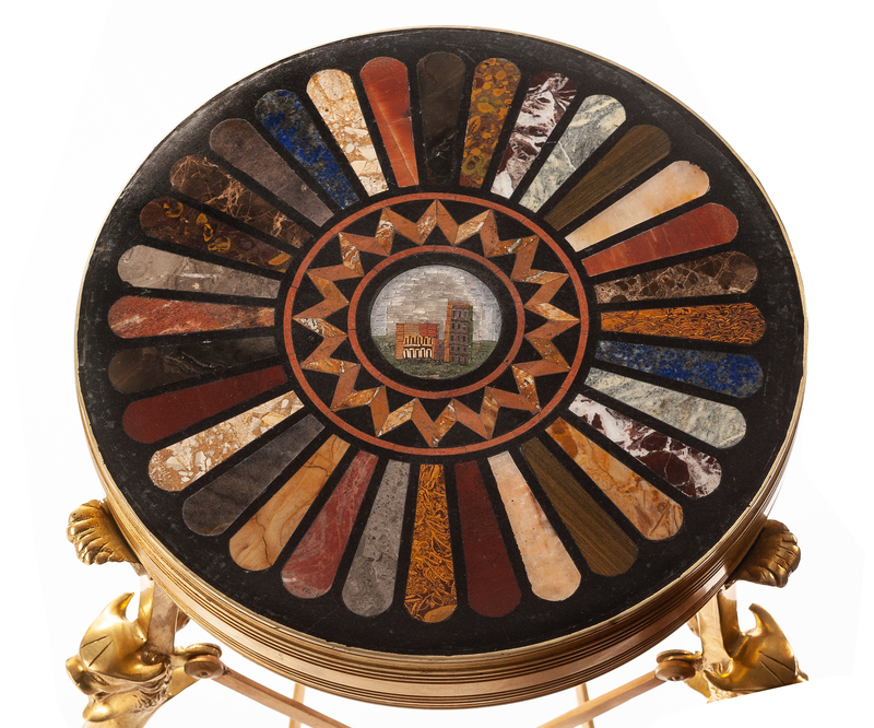 each having a specimen marble top with micro-mosaic decoration.
