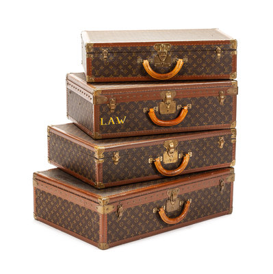 Four Louis Vuitton Suitcases Height of largest 20 x width 29 3/4 x depth 8 1/2 inches.