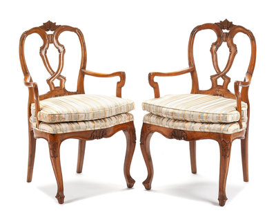 A Pair of Italian Fruitwood Armchairs Height 36 inches.