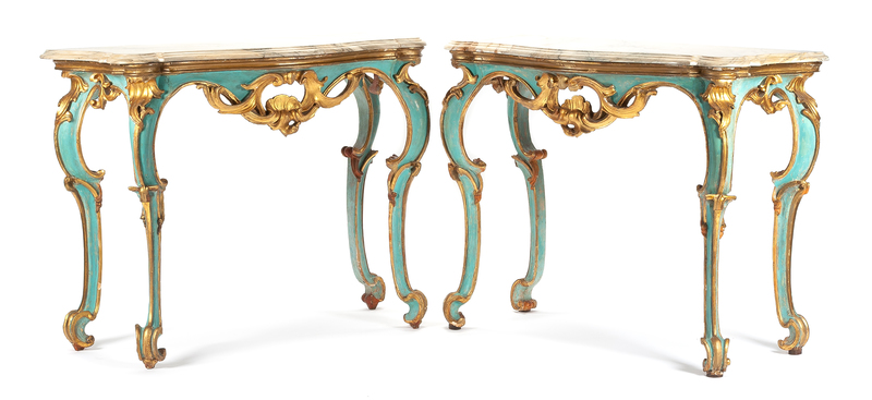 A Pair of Venetian Painted and Parcel Gilt Console Tables Height 34 1/2 x width 45 x depth 21 1/2 inches.