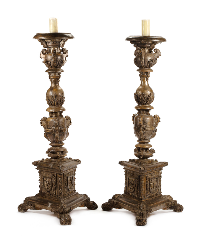 A Pair of Italian Giltwood Torcheres Height 65 1/2 inches.