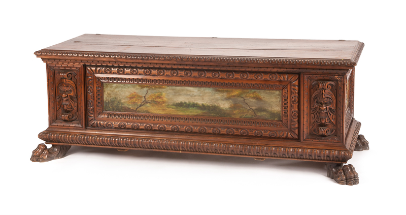 A Renaissance Revival Painted Walnut Cassone Height 24 x width 66 x depth 21 1/4 inches.