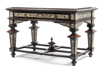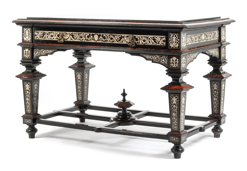 An Italian Inlaid and Tortoise Shell Mounted Ebonized Table Height 33 x width 51 1/2 x depth 32 inches.