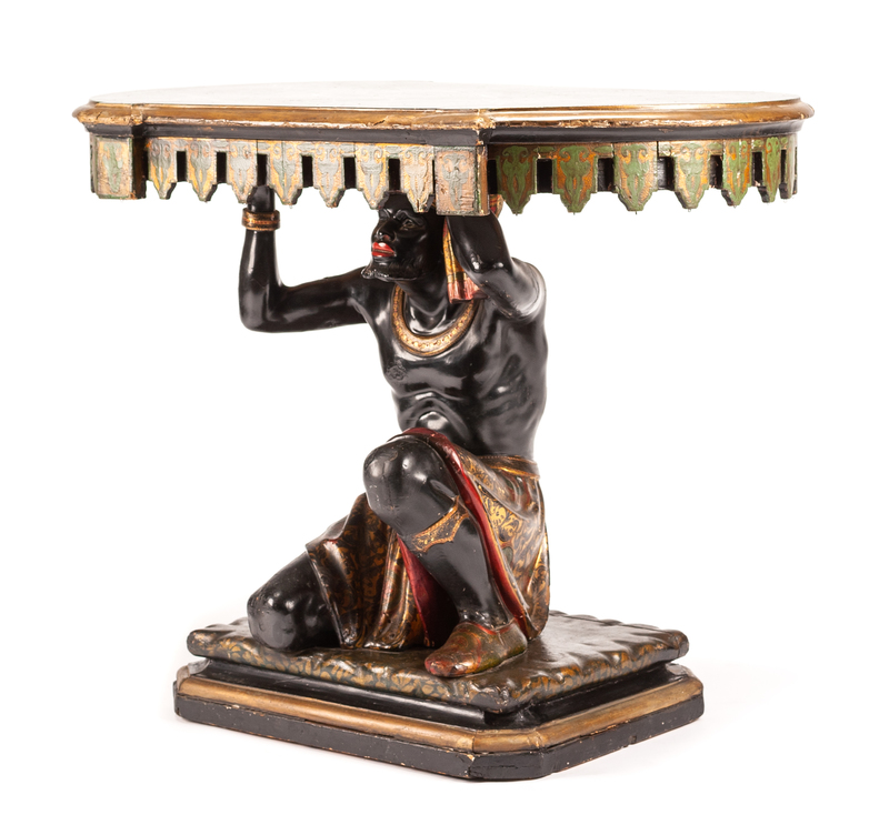 having a faux marble top supported by a kneeling male figure.