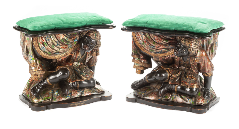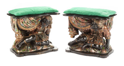 A Pair of Venetian Polychromed Figural Benches Height 21 x width 23 x depth 13 1/2 inches.