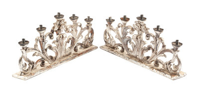 A Pair of Italian Silvered Wood Five-Light Candelabra Width 33 inches.