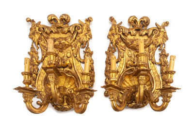 A Pair of Italian Giltwood Three-Light Girandoles Height 22 x width 15 1/2 inches.