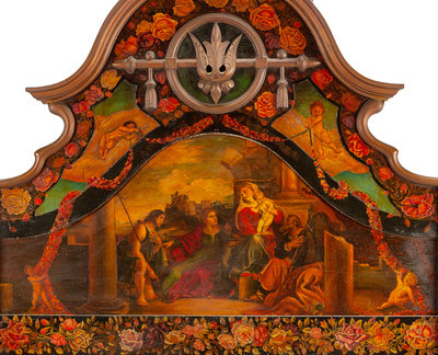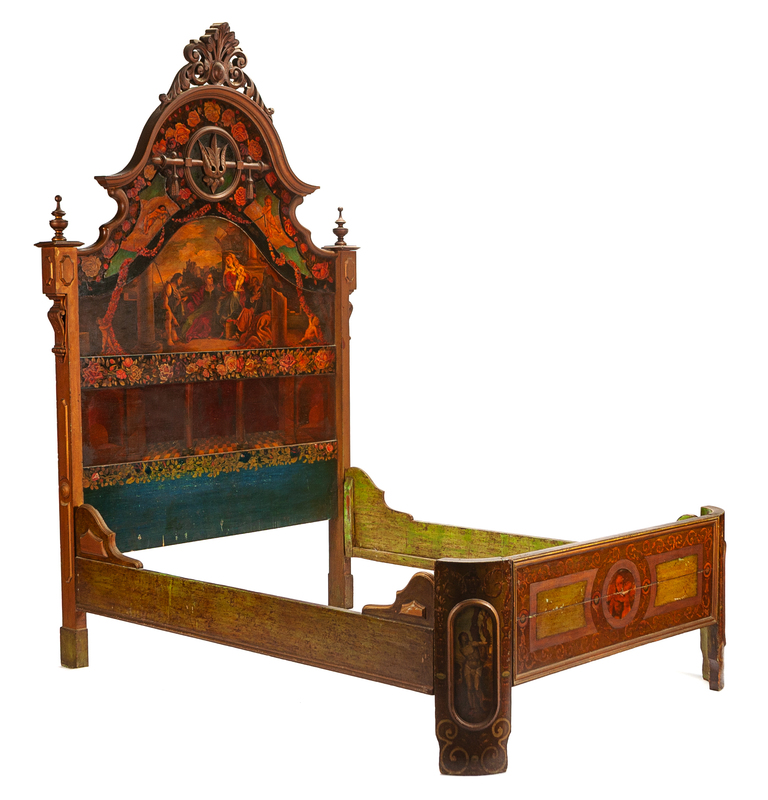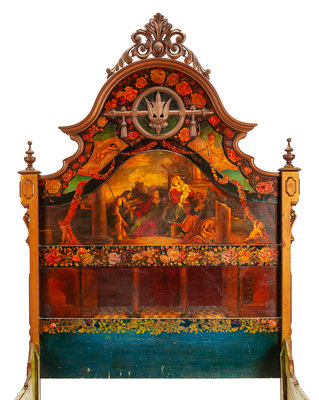 the headboard painted to show a biblical scene.