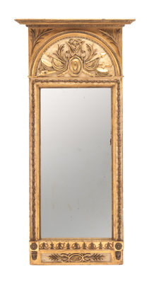 An Italian Neoclassical Painted and Parcel Gilt Mirror Height 73 3/4 x width 35 1/2 inches.
