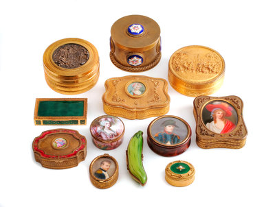 of various size, form and material, five set with portrait miniatures; 12 total.