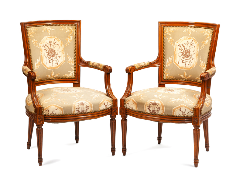 A Pair of Neoclassical Walnut Armchairs Height 34 inches.