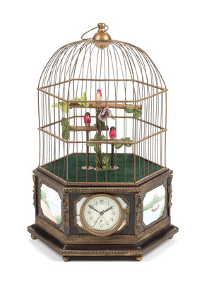 A Continental Porcelain Inset Automaton Birdcage with Clock Height 22 1/2 inches.