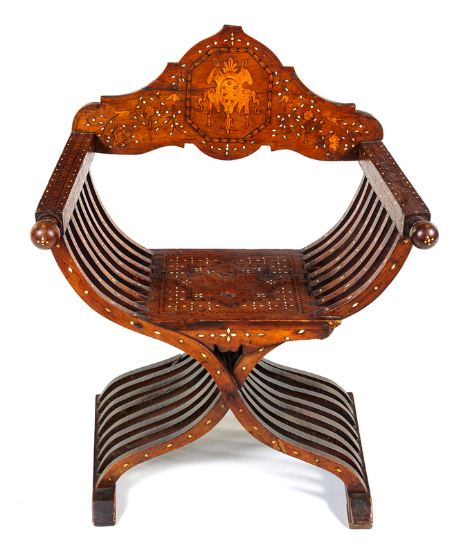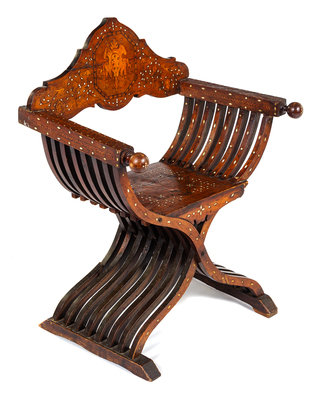 An Italian Mother-of-Pearl, Basswood and Ebony Inlaid Walnut Savonarola Chair Height 36 x width 28 1/2 x depth 20 inches.