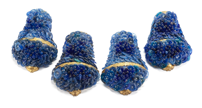 A Set of Four Gilt Bronze and Applied Glass Sconces Height 15 x width 10 x depth 6 inches.