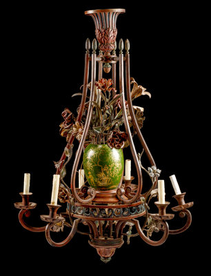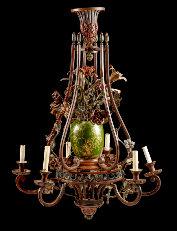 of cage form, the standard in the form of a flowering vase, wired for electricity.