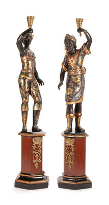 A Pair of Venetian Painted and Parcel Gilt Figural Torcheres Height 81 1/2 inches.