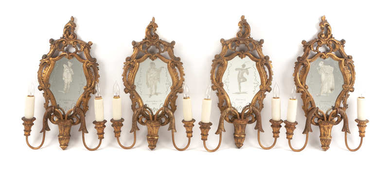 A Set of Four Venetian Giltwood Two-Light Girandole Mirrors Height 24 x width 15 1/2 inches.