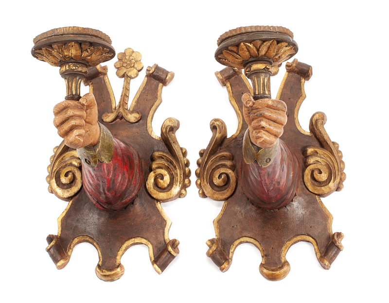 A Pair of Spanish Carved and Polychromed Single-Light Sconces Height 20 x width 11 x depth 18 inches.