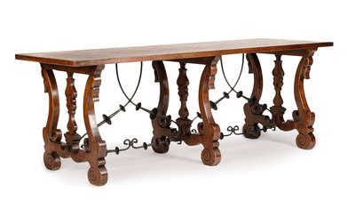 A Spanish Renaissance Revival Iron Mounted Trestle Table Height 32 x width 86 1/4 x depth 31 1/2 inches.