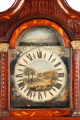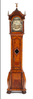 A Diminutive Dutch Marquetry Tall Case Clock Height 77 1/2 x width 18 x depth 11 inches.