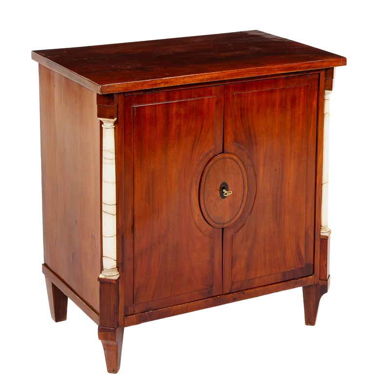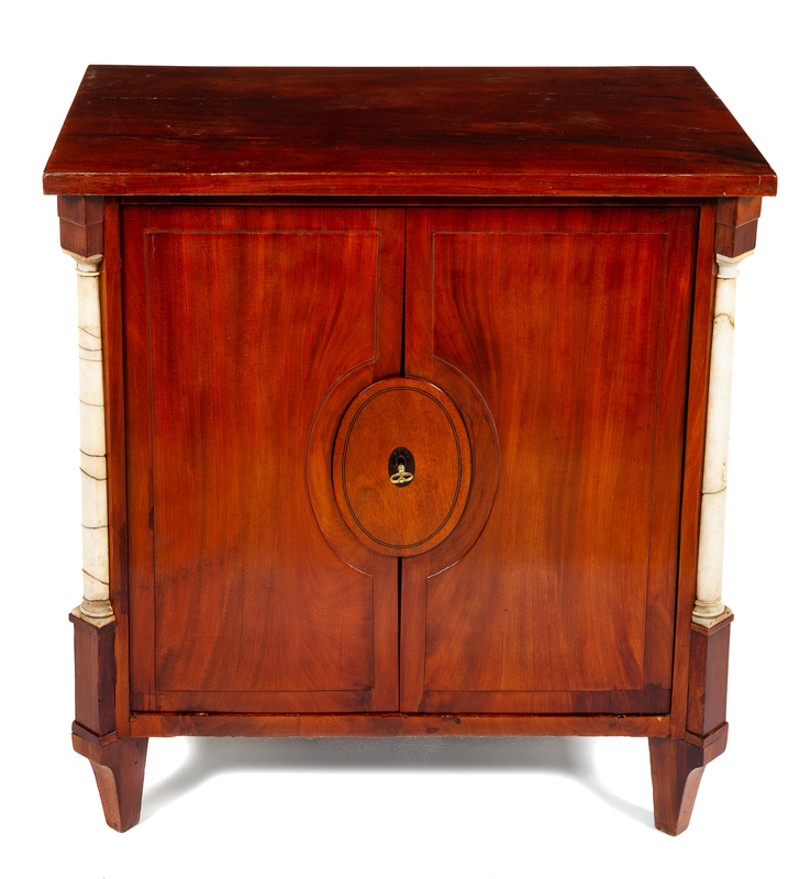 the rectangular top above two paneled doors flanked by marble columnar pilasters, raised on square tapering legs.