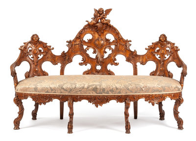 the shaped crest carved to show two cherubs above the openwork back forked to show latticework, foliate scrolls and rocaille, the oval stuffover seat raised on curved supports ending in scroll feet.