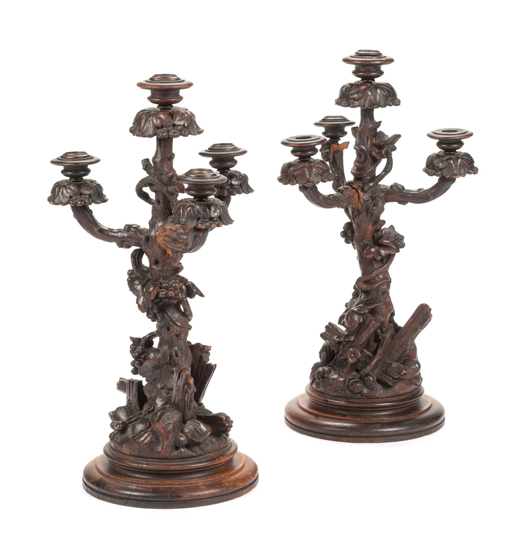 A Pair of Black Forest Four-Light Candelabra Height 21 3/4 inches.